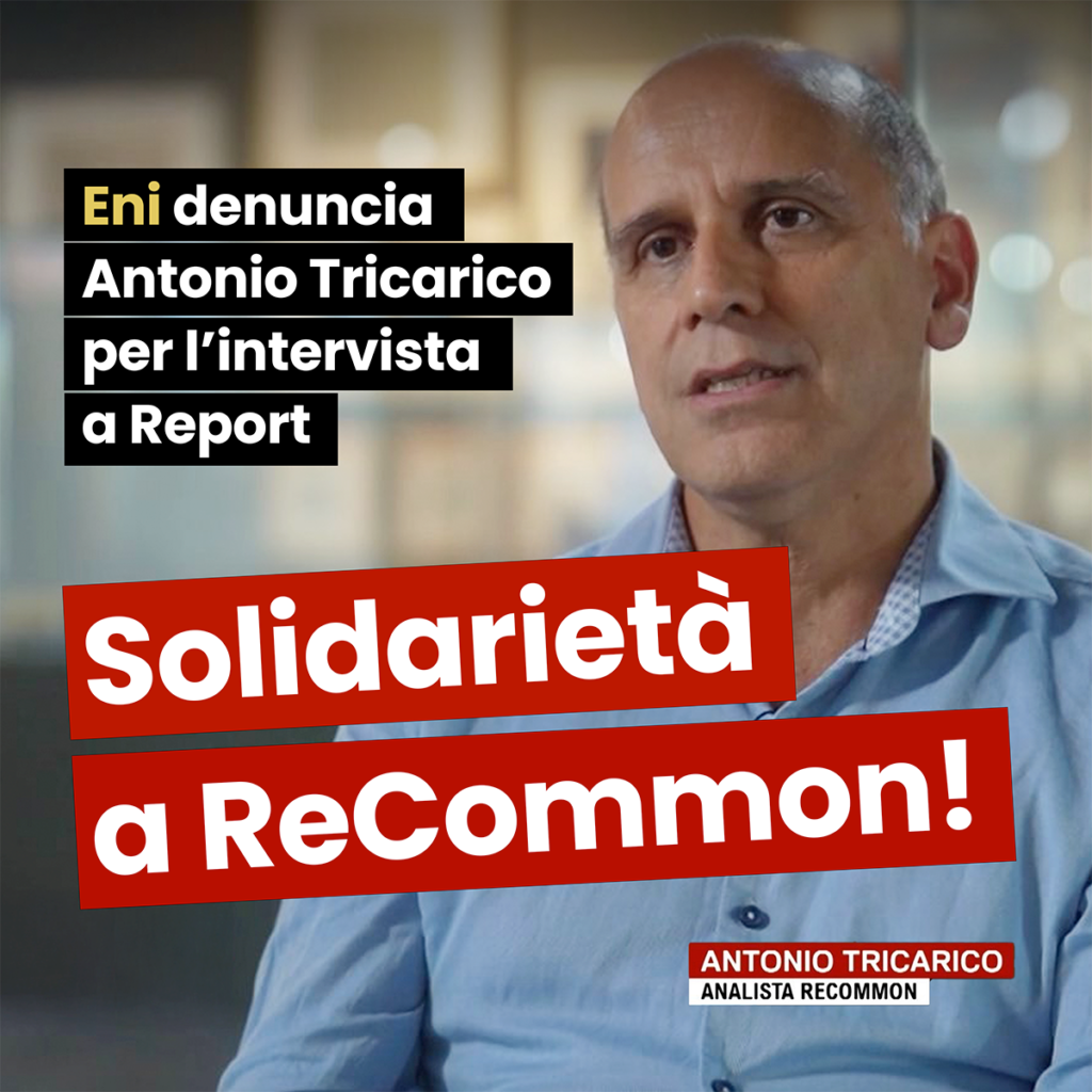 «ReCommon esprime la sua solidarietà ad Antonio Tricarico e ribadisce la ferma intenzione di continuare le campagne di comunicazione e di informazione sulla principale multinazionale fossile italiana, esponendo le sue responsabilità nella crisi climatica in atto. Invece di cercare di limitare la libertà di espressione della società civile italiana, i vertici di Eni farebbero meglio a ritirare la denuncia contro Tricarico e a valutare invece con attenzione l’operato del responsabile dell’ufficio legale della società (che ha firmato la medesima denuncia)  perquisito ed indagato dalla Procura di Milano nell’ambito della nota inchiesta sullo spionaggio e sul dossieraggio tramite accessi illeciti alle banche dati pubbliche» dichiara ReCommon.