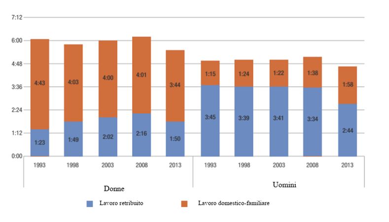 Se da un lato le donne dedicano in generale più tempo al lavoro che gli uomini, il coinvolgimento nei diversi lavori non è lo stesso. Le donne investono più tempo in quello domestico-familiare, mentre gli uomini ne dedicano di più al lavoro produttivo-mercantile. Questa distribuzione si mantiene tra il 1993 e il 2013, anche se il tempo che donne e uomini destinano a ogni lavoro è cambiato. Le donne impiegano un’ora meno nel lavoro domestico e di cura e mezz’ora in più nel lavoro retribuito mentre gli uomini dedicano ¾ d’ora al domestico-familiare e un’ora meno al retribuito. Nonostante questo le disuguaglianze persistono. In più, il divario di genere è diminuito in maggiore misura rispetto al tempo del mercato del lavoro che rispetto a quello domestico e di cura.