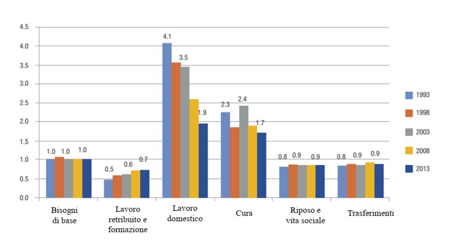 Per quanto riguarda il lavoro di cura, però, il miglioramento non è né chiaro né graduale come lo è nel lavoro domestico: nel 1993 le donne dedicavano 2,3 volte più tempo degli uomini a questa occupazione e vent’anni più tardi, 1,7 volte di più, mentre le maggiori disuguaglianze si registrano nel 2008, anno in cui le donne hanno dedicato alla cura 2,4 volte più tempo degli uomini.